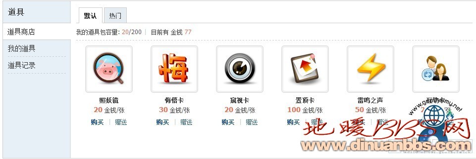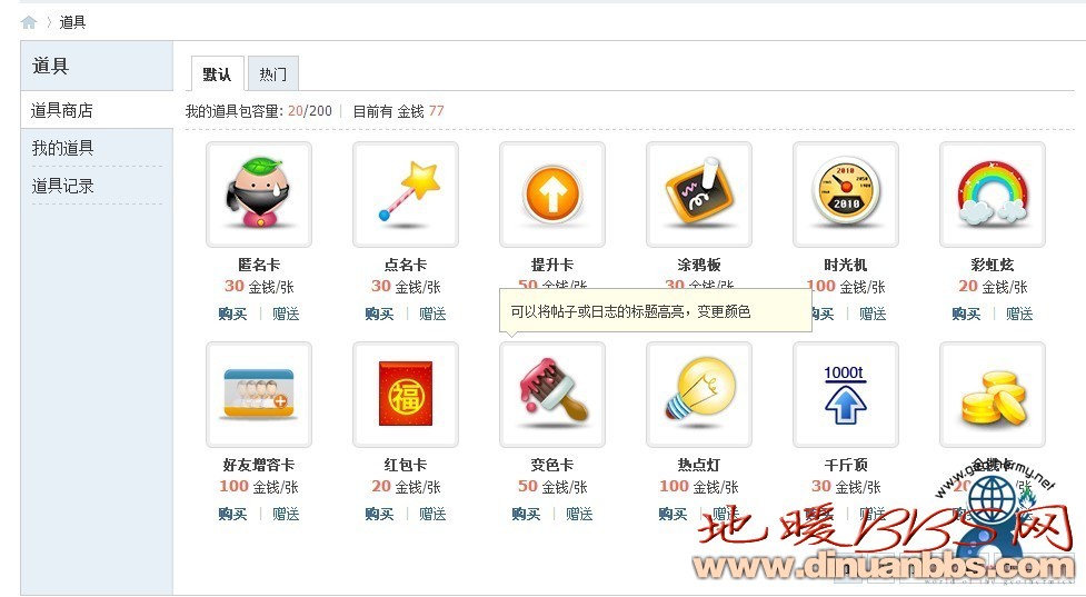 匿名卡:可以将自己的帖子匿名,隐藏身份。变色卡:可以将主题高亮,变更颜色。雷达卡:查看某个用户是否在线。沉默卡:可以将主题关闭,遏止答复。点名卡:发通知给自己的好友,让他们来查看自己的日志。提升卡:可以提升某个主题。附件增容卡:增加附件容量上限。探测器:探测埋了红包的会员空间。涂鸦板:在日志、帖子中使用涂鸦板。好友增容卡:增加好友容量上限。红包卡:将自己的一局部积分埋在空间,来访者可以点击获取。彩虹炫:在日志、相册评论中使用彩虹炫。时光机:把自己日志的发布时间修改为过去。金钱卡:可以随机获得特定积分。